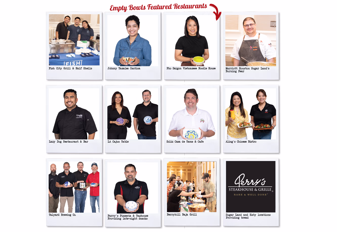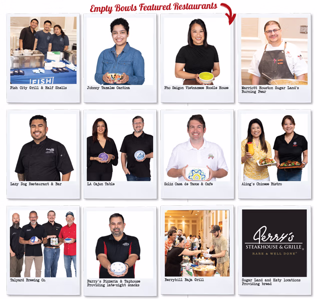 This year’s Fort Bend Empty Bowls Title Sponsor is Houston Methodist Sugar Land Hospital. Now in its 17th year, the dinner provided at Fort Bend Empty Bowls includes a simple, but delicious, meal of appetizers, salad, bread, and various soups provided by 10 local restaurants. And don’t leave early – you’ll miss the tasty late-night snack as you walk out the door.