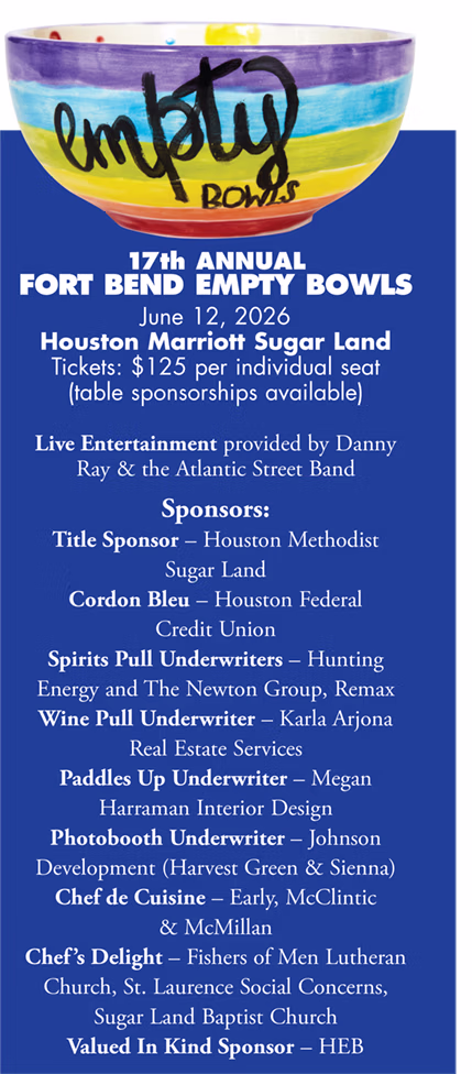EFBHNM has been helping its Fort Bend neighbors for more than 35 years. Join them by purchasing Fort Bend Empty Bowls tickets, available at www.humanneeds.org/empty-bowls. Various sponsorships are still available.